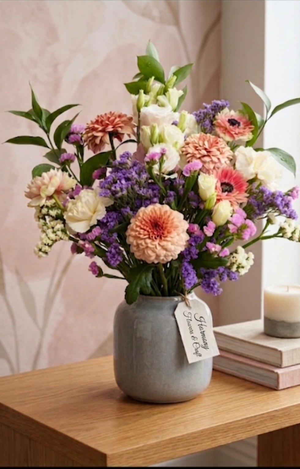 • Vase: Presented in a minimalist, matte grey ceramic jar with a “Harmony Flowers & Craft” tag.