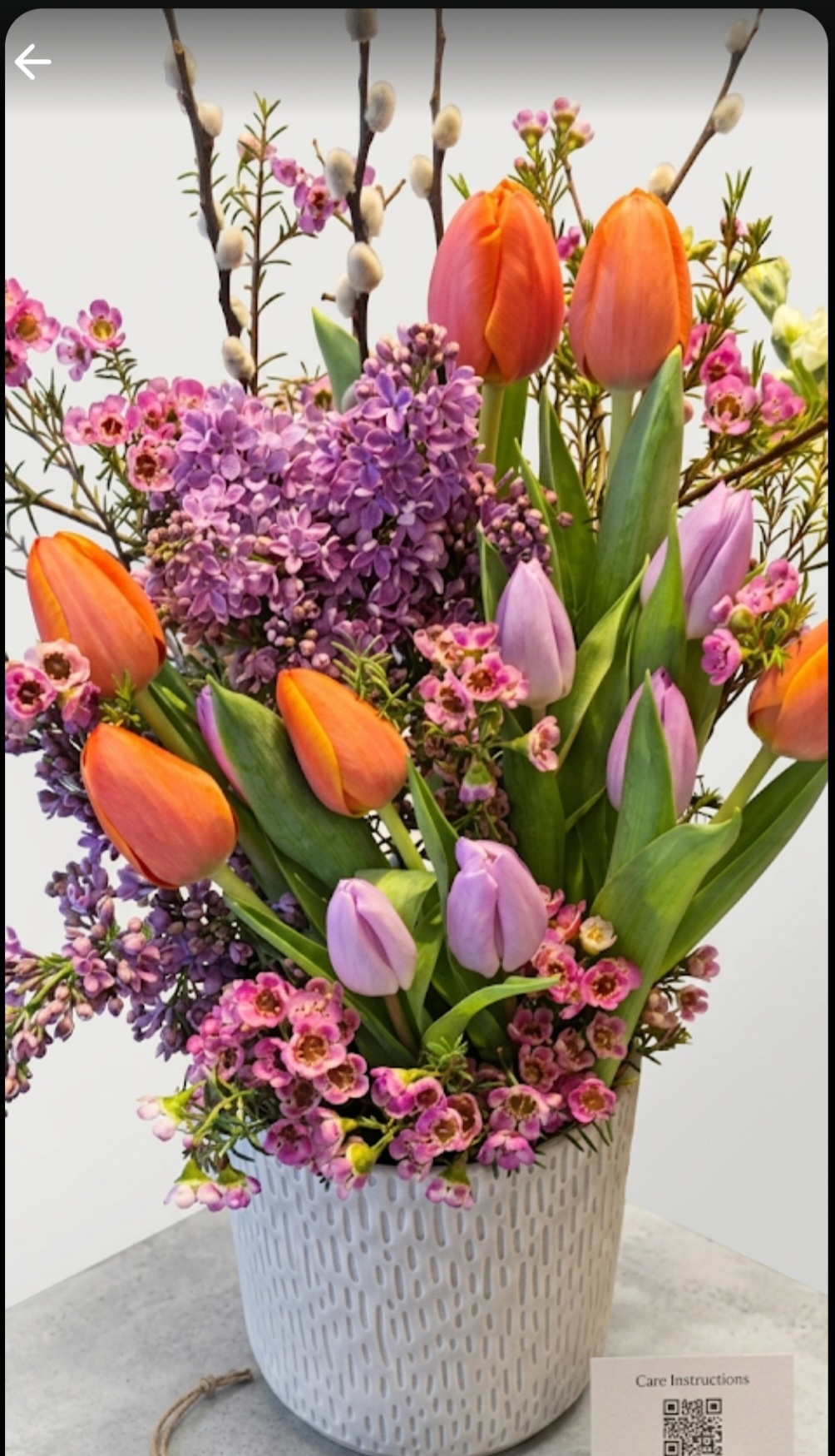 Bring the freshness of a spring morning indoors with this charming seasonal arrangement. Nestled in a stylish, textured ceramic pot, this bouquet is a celebration of texture and soft pastel colours.