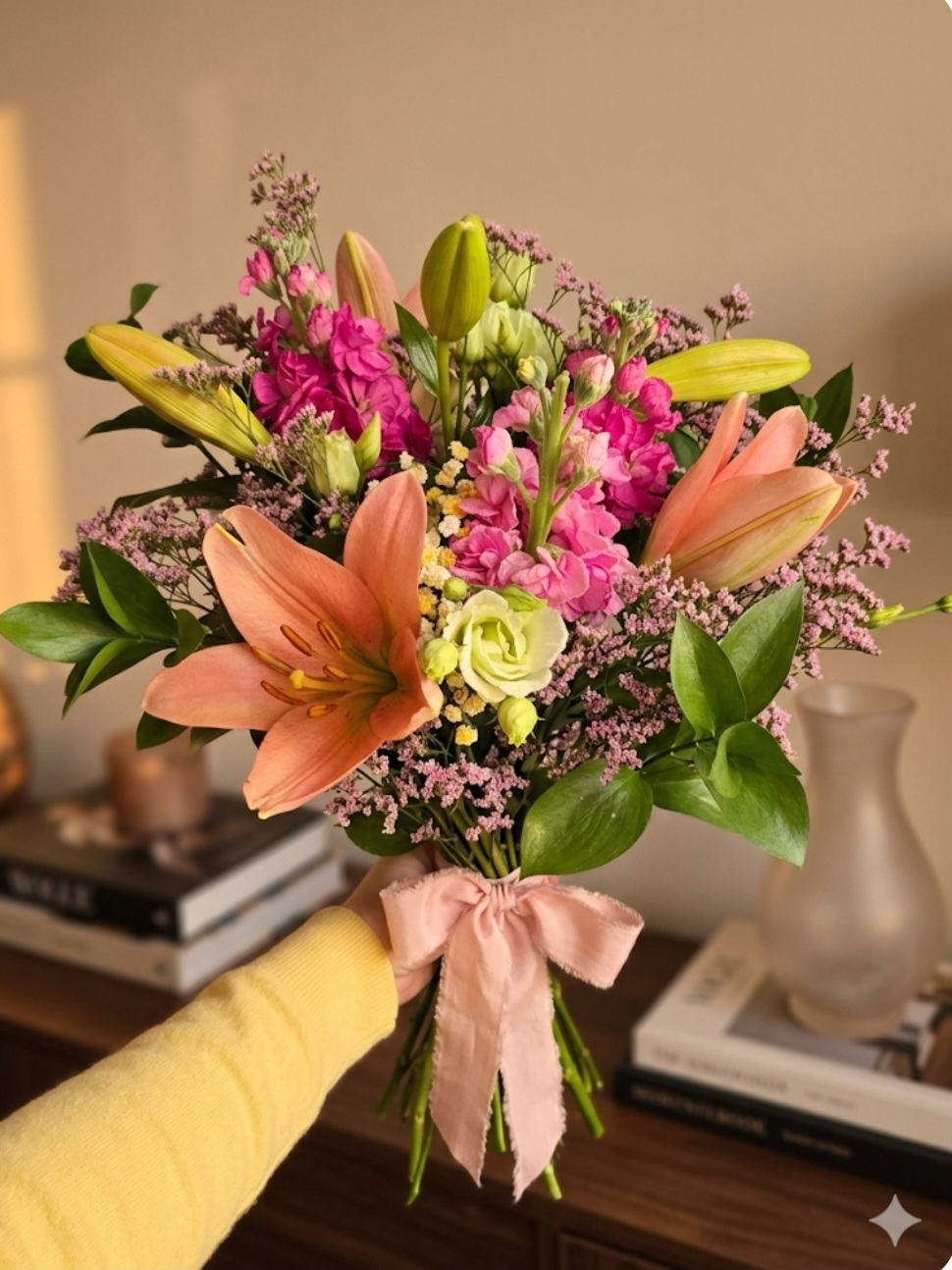 This beautiful hand-tied bouquet features a warm and cheerful palette, perfect for brightening any space.